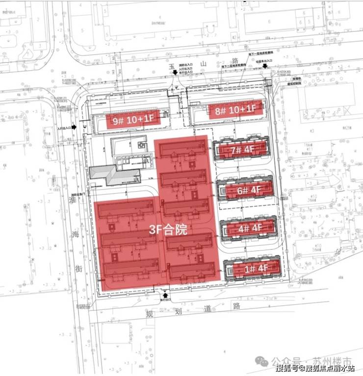 搭配下沉式庭院会所,南向为车行出入口,北向玉山路设立人行/车行出入口,西侧淮海街设立人形出入口和消防应急门。