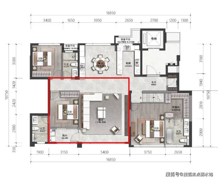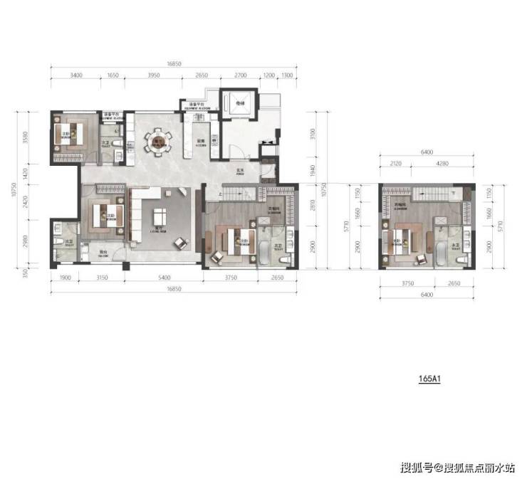 ---建面约165方四房四卫,做了三套房全明格局,市面上罕见。可以视自身需求,改成三房三卫,将南向一房纳入客厅,做成横厅,尺度感和排面感更足,可以排布中西厨、岛台、大圆桌,或者开放式书房等等: