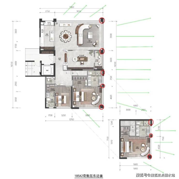 一线看江错跃185方,东边间边厅户型,东侧、东北侧看江,定价最高,9折折后均价约3.06万元/㎡;