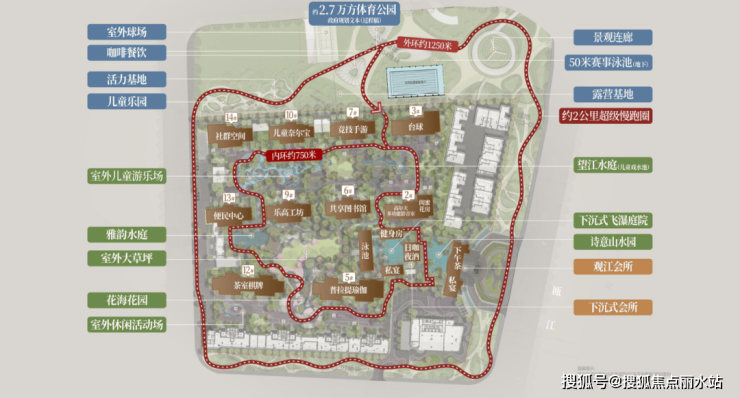 还有下沉式飞瀑庭院设计:围绕着飞瀑景观,规划了下沉式会所,有恒温泳池、私宴厅、健身房、行政酒廊等;架空层泛会所有品茗区、儿童空间等。