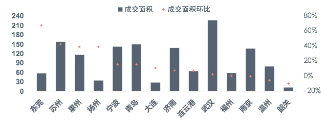 二线代表城市环比上升9.74%,同比上升92.8%。环比上升的城市中,苏州升幅显著,为42.6%;宁波次之,升幅为15.6%,青岛升幅15.4%,排名第三;环比下降的城市中温州降幅较大,为5.7%。三线代表城市成交量环比上升31.6%,东莞升幅较大,为67.5%,另外惠州升幅居次位,为38.9%。同比来看,整体下降9.9%。