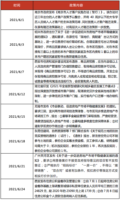6月,财政部、自然资源部等部门联合发布将土地出让收入等四项政府非税收入划转税务部门征收的有关通知。国常会指出,加快发展保障性租赁住房的政策,主要通过增加供给、支持改建、降低税负三方面,缓解新市民青年人等群体住房困难。绍兴、西安、无锡、广州天河区等多地出台楼市调控新政,加大对房地产的管控力度。