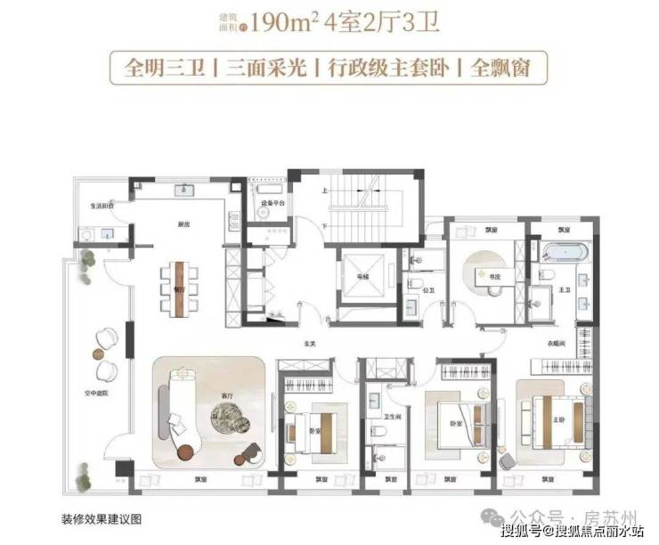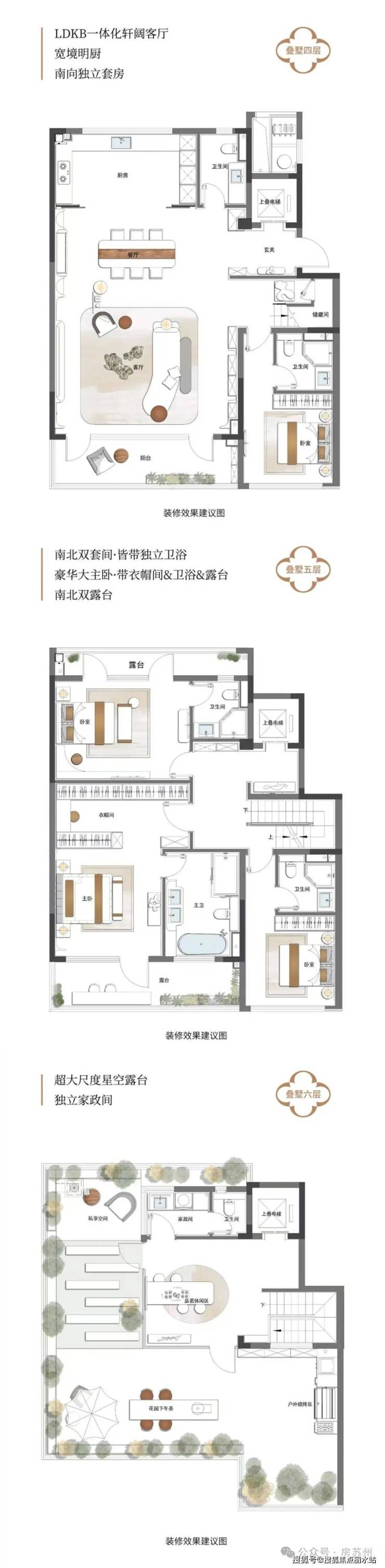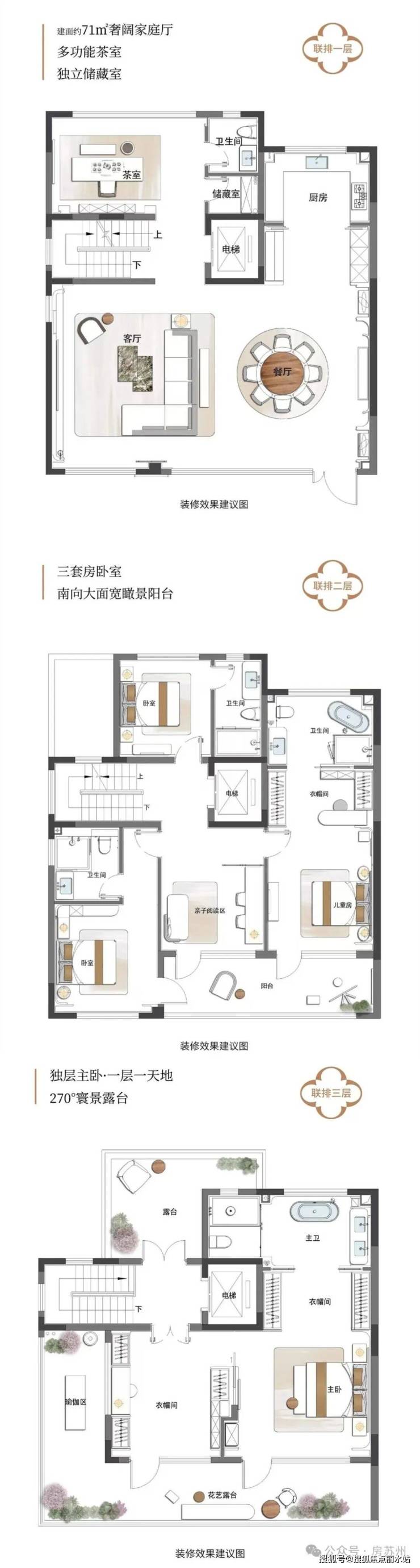 南向三卧,其中主卧带衣帽间与双台盆卫浴,朝南还带一个建面约22.75㎡空中庭院。