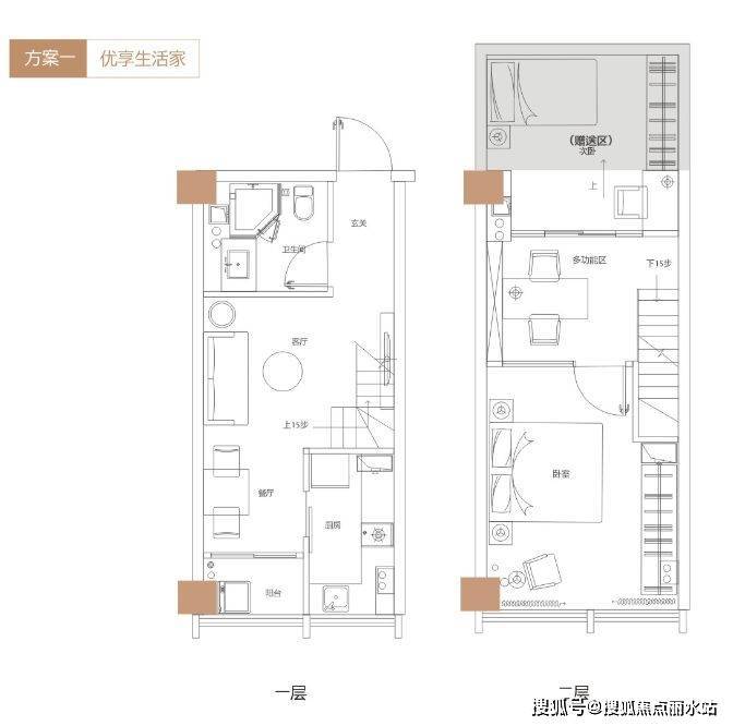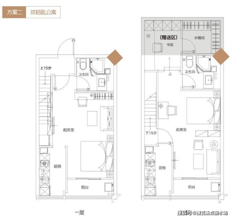 2、进阶版—双钥匙设计。两个入户门,上下两层相互独立,互不打扰,一层是厅卧厨卫功能性齐全的单身公寓;二层则因为超大的赠送面积,完全可以做到两室一厅一卫一厨,出租的话,买一个户型租两户,得双份收益,相当划算。