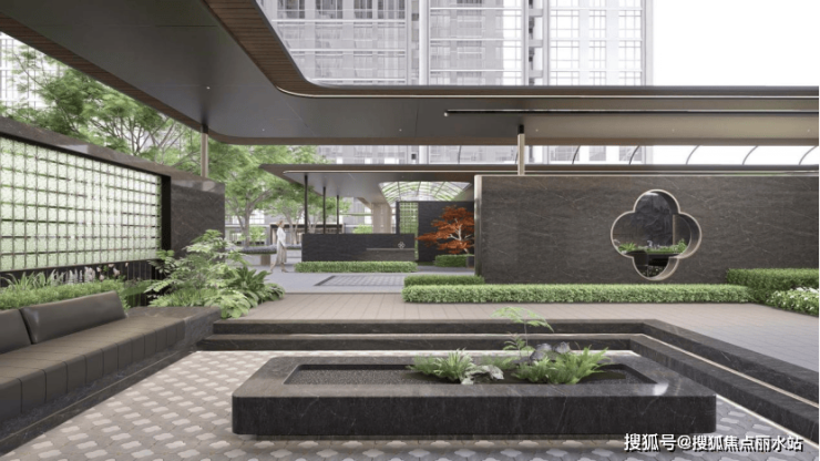 ▷地面「水梦天地」:西班牙油橄榄+日本羽毛枫,浅表水景倒映千年古城