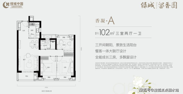 建面约102平户型:入手门槛较低,且三个房间都有飘窗设计,再加上南向阳台,有优化面积可利用。