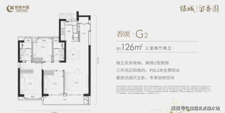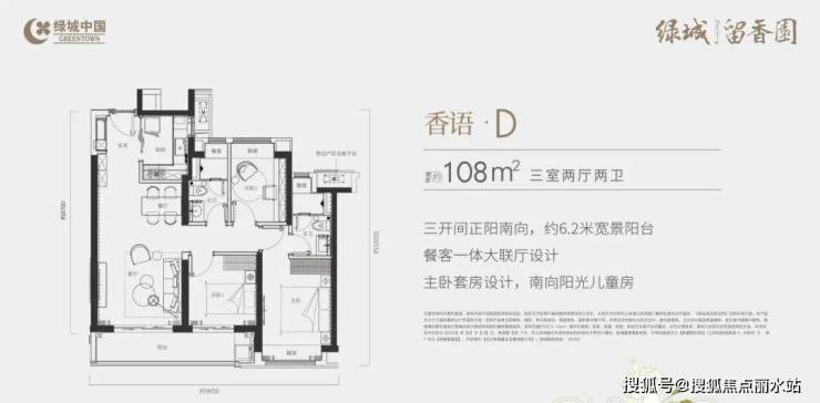 建面约108平户型:三开间朝南,约6.2米宽景阳台,主卧套房设计。