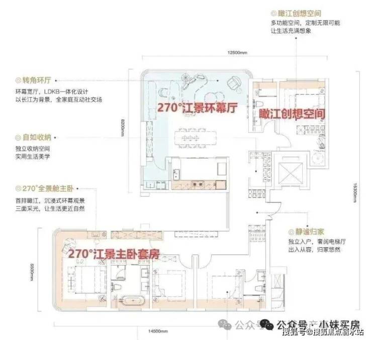 做出了约40㎡江景环幕厅+瞰江创想空间+270度瞰江主卧的无敌配置,是武汉楼市罕见的双全景舱观江户型。