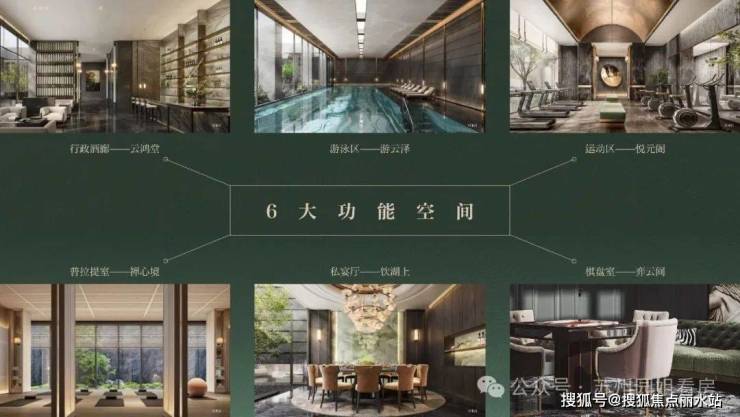 超1900㎡下沉式高配会所——鸿湖荟,以东方雅序的手法融合了行政酒廊、游泳区、运动区、普拉提室、私宴厅、棋牌室六大功能空间。