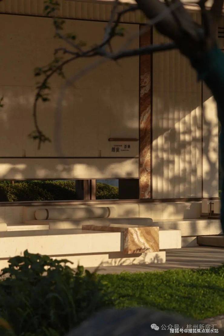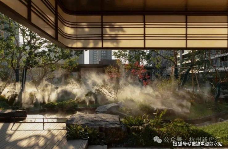 御潮印的下沉式园林打造了世纪城独一份的约300㎡飞瀑松院。园林中央精选多棵名贵泰山松,高度统一近6米,运用全冠移植技艺,入园即是最佳观赏形态;不远处近6米高飞瀑倾斜而下,实现庭院三级叠水,瀑布声和叠水声混合成一曲自然乐章,动静结合,多了些赏玩之趣。