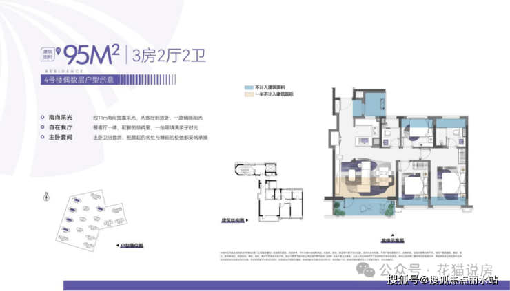 建面约95平:这是软件谷区域内此面积段唯一的横厅三房产品,而且是双卫,客厅约5.4米开间,外接大露台,整个户型拥有约11米南向面宽,采光、观景极佳。主卧套房布局,可做L型衣柜,空间奢侈。