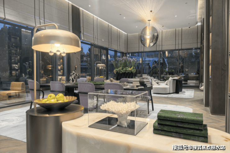 社区大堂:结合建筑结构,不做过多的装饰面,建筑外天花、地面、墙面材质及弧形造型延续到室内,天花如漂浮的云朵,形成一个室内外无边界的生活场所。水滴形状的现代吊灯,山石形状的前台如行云流水中石头一样平静。舒适的沙发休息区结合当代的艺术品,营造奢华酒店大堂般的体验感。