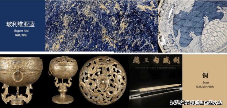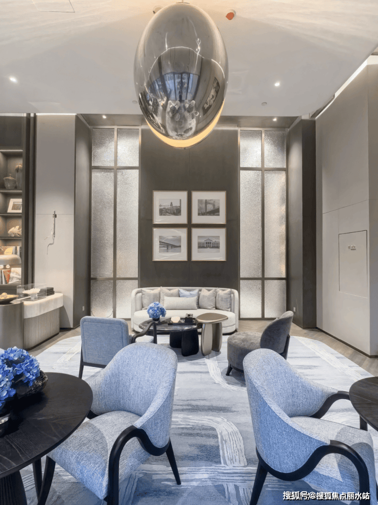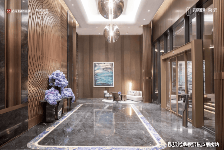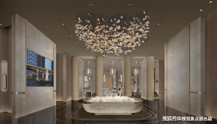 墙面艺术:石材与内嵌金属铜条增加细节和奢华感。天花水晶灯与灯光效果结合如波光粼粼的江水水滴。空间弧形造型及线条如行云流水般舒畅,体现空间高山流水的设计主题。