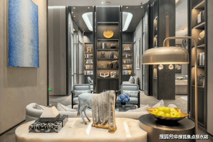 洽谈区:以木饰面与墙布为主,书柜和灯光形成静谧休闲的阅读洽谈氛围。客人仿佛置身于奢华酒店行政酒廊,营造度假般的归家氛围感和仪式感。
