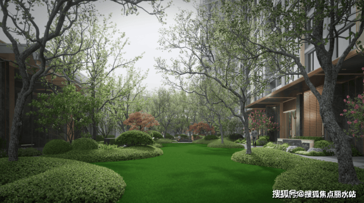 浮光水院:景观通过高差的营造,形成丰富的立体自然花园。水系勾勒空间,从会客厅的下沿缓缓流出,在乌桕林间穿梭,营造蝉鸣幽静的自然意境,以“自然共生·社交无界”为核心理念,重新定义社区交流场景。