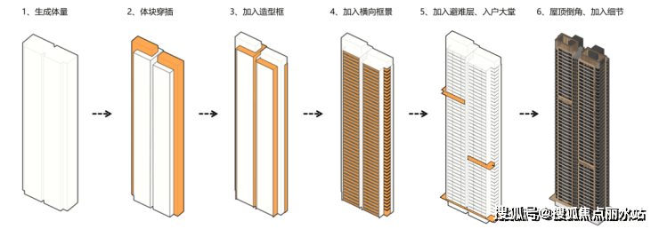 体量生成:建筑强化体量咬合关系,非对称形体切割且倒角处理,以微弧的波浪元素呼应长江文化。