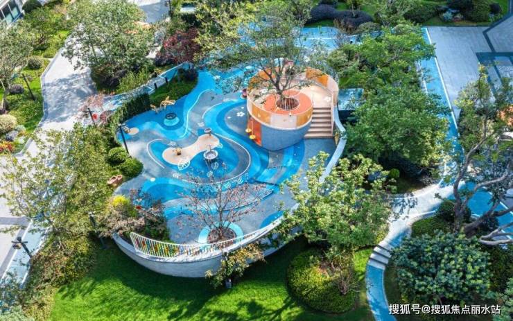 高空视角下,曲径通幽的步道+大面积儿童活动区+丰富绿化有机结合,美学浓度还挺高。