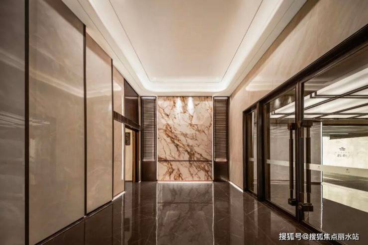 电梯厅内部,以古铜色不锈钢金属电梯门搭配仿皮革木板铺面,再辅以蓝翡翠岩板点缀。