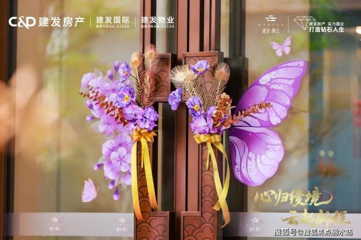 嚯,这交付现场,怎么搞得跟艺术展一样?浪漫的紫色主题,巨型蝴蝶雕塑、紫色地毯、连单元门上都贴着蝴蝶,这审美也太出圈了!