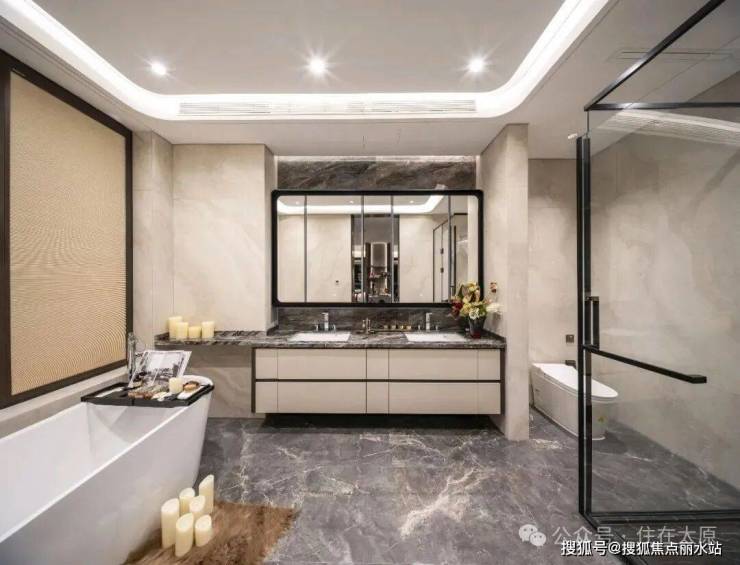 1.2×1.8米超大仿石砖墙面一气呵成,光影变幻间演绎低调奢华。双台盆设计从容应对晨间时光,独立淋浴房与浴缸区满足多元沐浴需求。