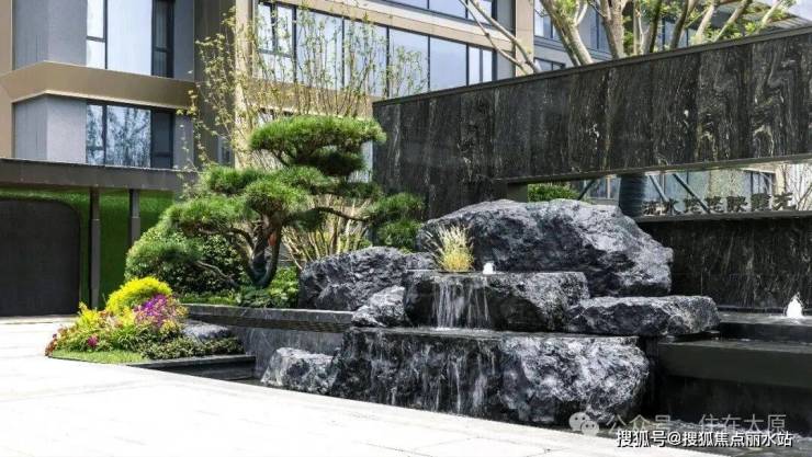 另一侧,突破传统造景桎梏。摒弃平面水景,创新采用立体叠水艺术。层层石阶构建立体水景层次,清泉自高处潺潺跌落,奏响“清泉石上流”的现代乐章。