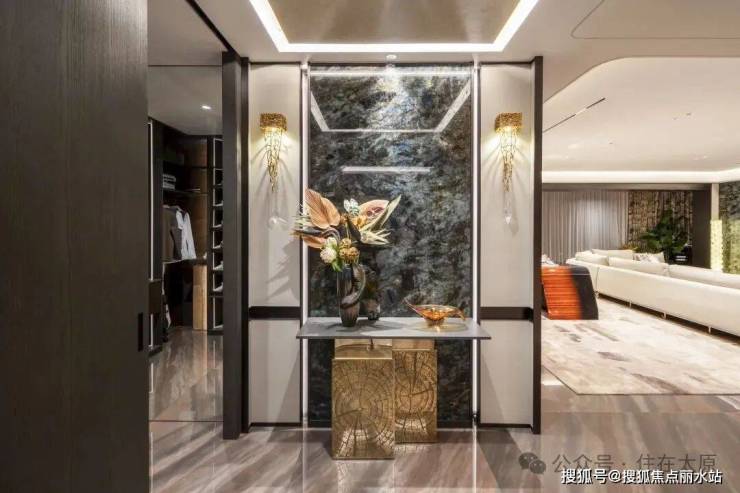 缓步穿过连廊,巴西进口宇宙金奢石景墙赫然入目。每一块天然石材历经严苛筛选,独特的金色脉络在阳光下流转,尽显奢华底蕴。