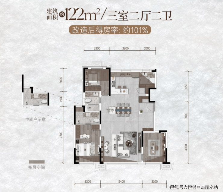 曜玥 ——光曜揽月,写意质感人生阶段,建筑面积约105㎡三室二厅二卫,改造后得房率达96%。空间通透奢阔,主卧270°观景落地窗,超大景观视野,尽揽园区四季美景。