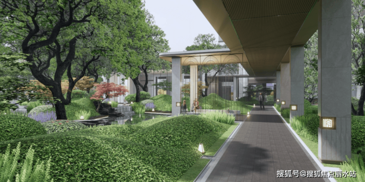 十花园其一:【水岸花厅】中心水院空间“聚水为财,流水生财”,中心庭院巧妙运用“以小见大,一步一景”的设计手法,以叠水布局,利用树木、花境、喷泉、构筑等元素,搭配组合出相映成趣的视觉效果,营造松弛雅致的水苑客厅。