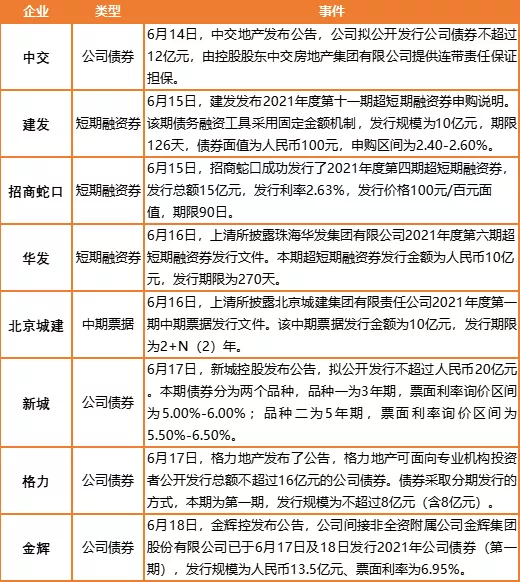 上周,房企融资类型以公司债和短期融资券为主。其中,新城控股拟公开发行不超过20亿公司债;招商蛇口完成15亿元超短融资券发行;建发发行10亿元超短期融资券。