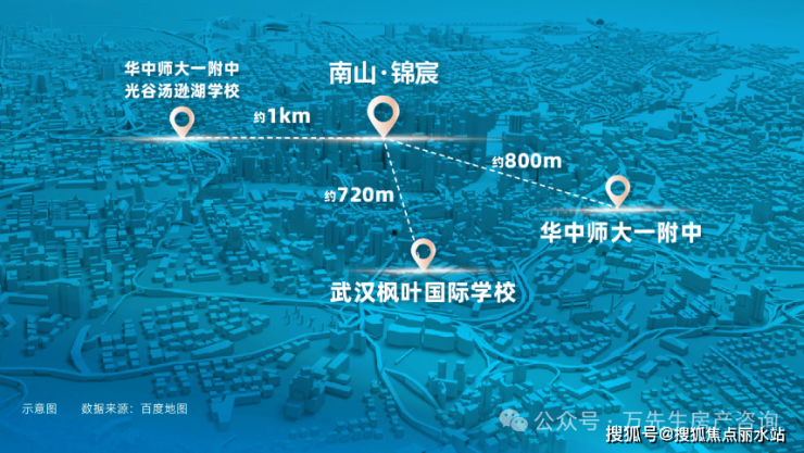 离项目直线距离仅800米,即是湖北最好的省级示范中学——华中师大一附中,历年高考重点率、名校率、高分率均居省内榜首,是名副其实的湖北状元摇篮。
