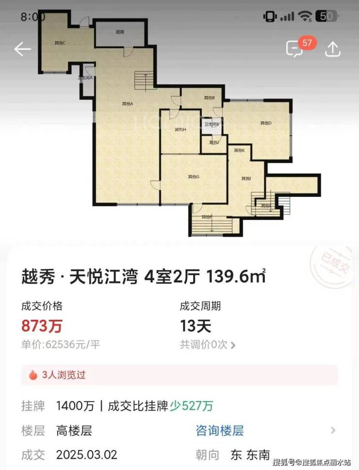 结果最终成交价惨淡到只有873万,单价才6.2万/㎡。