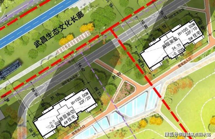 项目共由3个地块组成,A1地块与其他两个地块被武昌生态文化长廊隔开,独立成一个组团,该地块一线临江,但从楼栋分布来看,是与长江垂直的方式布局,观江面并不大,该地块两栋楼都是呈西南朝向,偏西的角度很大。