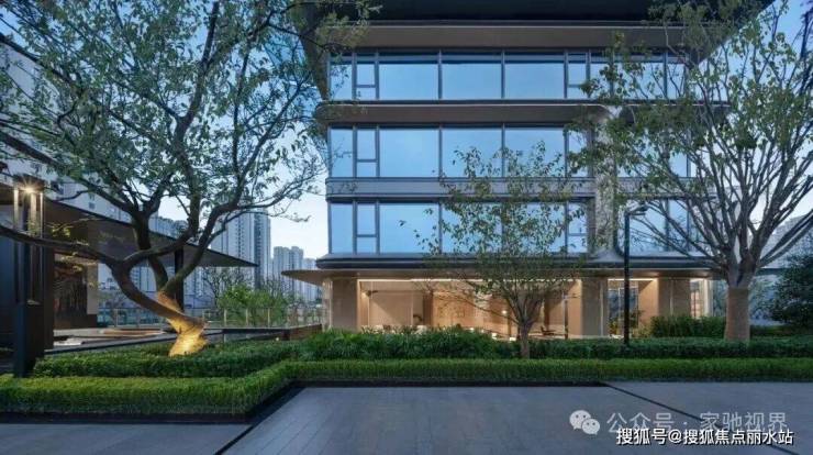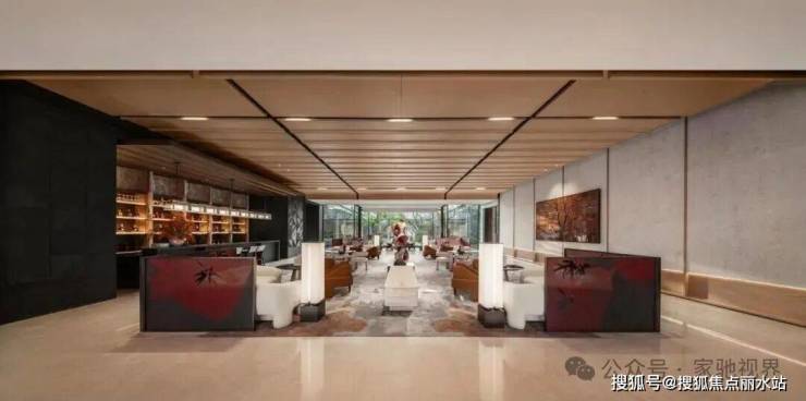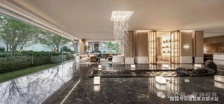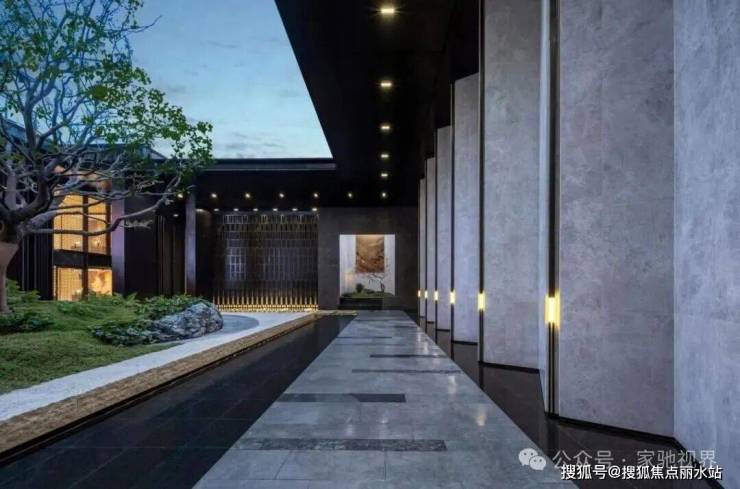 约80米的三进归家长廊,启程一段心灵逐渐安放的旅程。一进“鎏光华堂”,以约9米挑高穹顶大堂与定制艺术雕塑,营造恢宏的迎宾气度;二进“拾光艺廊”,通过约18米隐奢光影连廊,实现从开放到私密的空间过渡;三进“浮光水庭”,以特选百年榉树与水景平台相映,形成静谧的庭院核心。这三重递进的空间节奏,赋予归家路径以艺术体验与情绪共鸣。