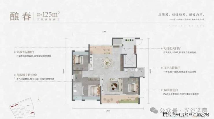 建面约125㎡的三房两厅两卫,是全封窗的准四代产品。