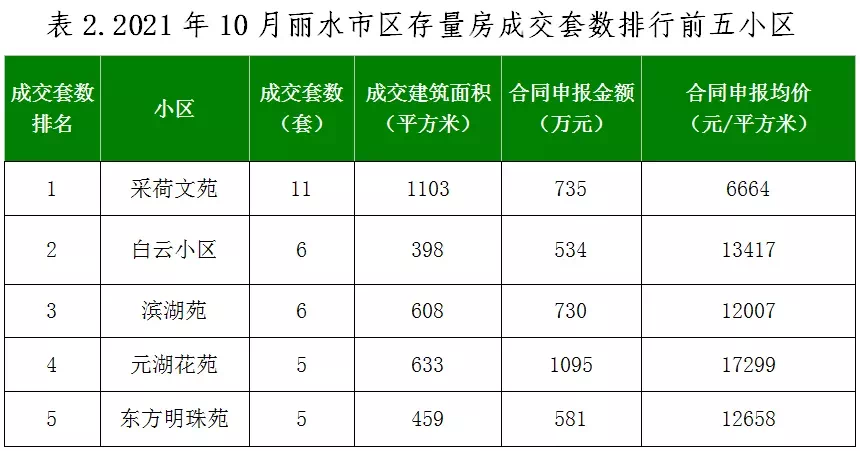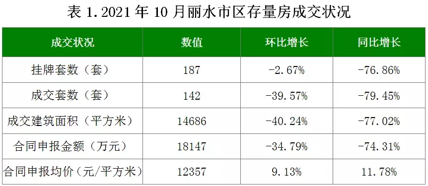 2021年10月丽水市区挂牌存量房187套,成交142套,成交总建筑面积14686㎡,合同申报金额18147万元,合同申报均价为12357元/㎡。