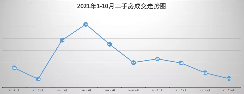 市区二手房成交量再次下行,仅142套,环比下跌39.57%,创近四年以来第三低点;成交金额18147万元,环比下跌34.79%。