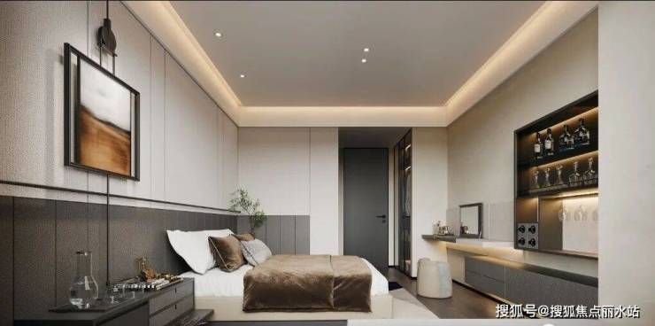 主卧大套房,站在飘窗前,楼下的满园景色皆在眉眼之间。这里设计了一个非常人性化的使用场景:卧室内独立小水吧。在这儿配备迷你饮水机,半夜起来想喝水,连厨房都不用去了,再也不用担心影响睡眠较浅的老人和孩子了。