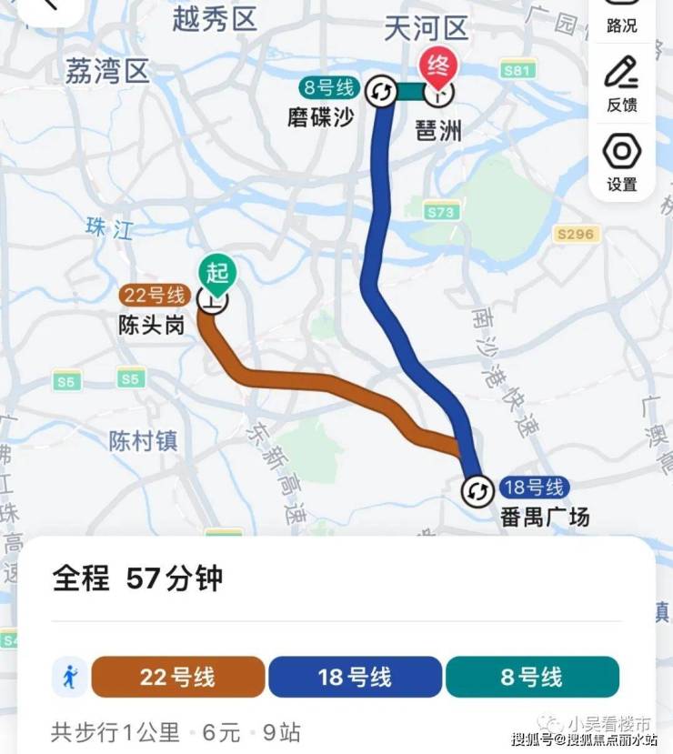 地铁去往万博:小区步行至陈头岗站,乘坐22号线到番禺广场换乘18号线,再到万博仅4个站,全程耗时36分钟。