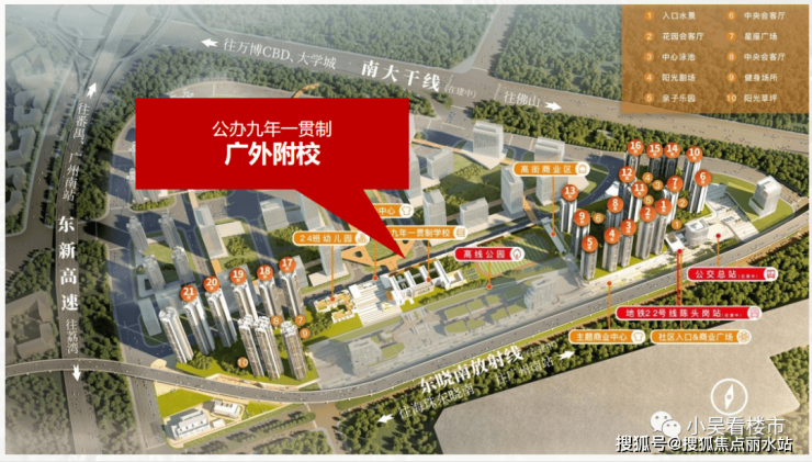 小区自身带一所45班的九年制广外附校,提供了1350个小学学位和750个中学学位,一般来说。户数与学位比例是1:4,星瀚TOD总户数为4378户,小学学位与户数配比为1:3.24,高于平均标准。