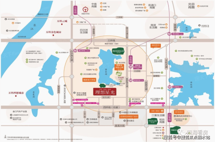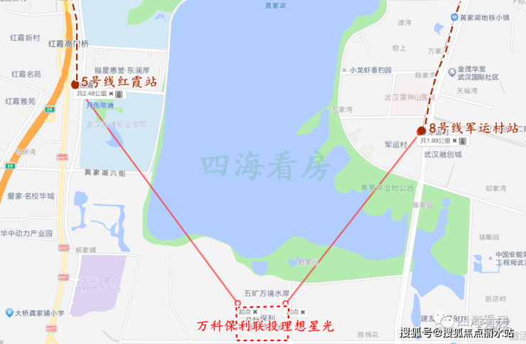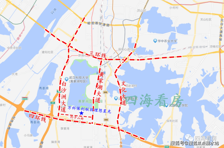 万科保利联投理想星光位于豹山街与山湖大道交汇处,楼市划分属于军运村黄家湖新区板块,行政划分属于江夏区,项目距离距离三环线约5.9公里,属于三环外。
