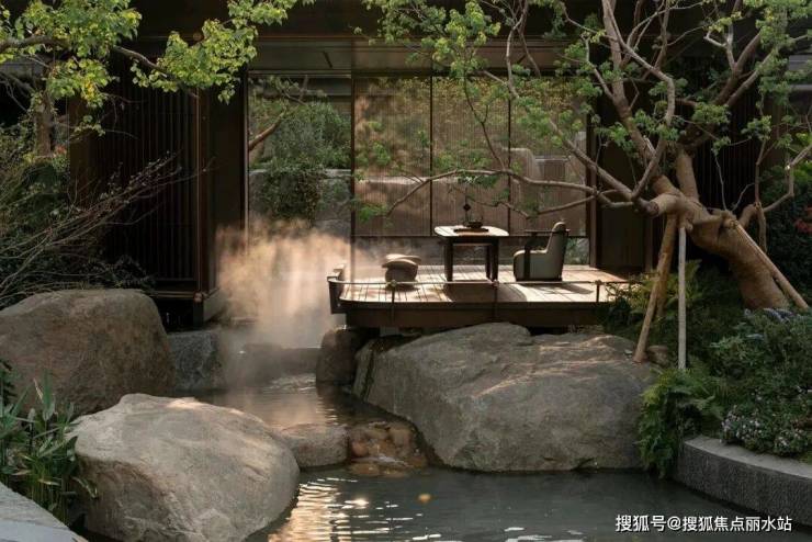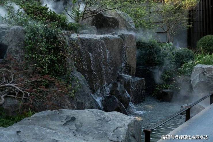 茶轩悬浮于石溪之上,水从底部石上流出,深郁的山坳间腾起云雾,弥漫浮动,吞吐变灭。山石自然参差,有沟涧、宽溪、石隙,水在其间流淌、跌落,激荡自然而然的山水清音。山苍树秀,水活石润,世事流淌人在其间,纷扰的尘嚣远去,喧嚣的声音荡尽,回归最原始的静寂的天地。