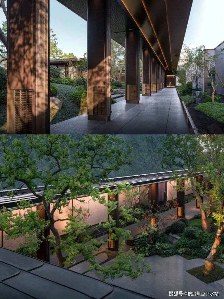传统的斜坡建筑连廊与现代简洁的平顶连廊通过一道柱廊隔开,狭长的甬道结合序列廊柱,形成一幕幕步移景异的框景,在此布置特色座椅,在驻足停留感受自然的画境和诗意的魅力。