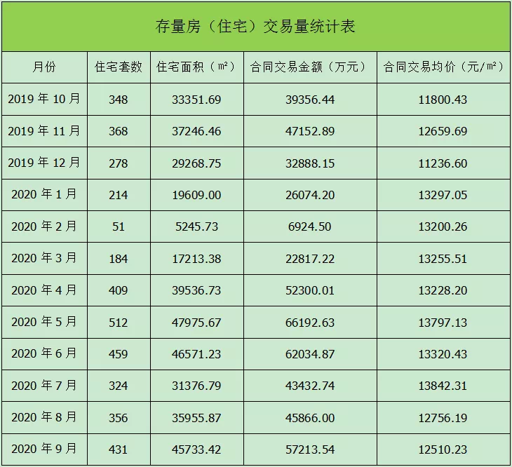 据丽水不动产中心统计,2020年9月份市本级(不含开发区和莲都区分中心)共办理存量房交易登记683套,成交面积65781.97平方米,合同交易金额84342.04万元。其中住宅431套,成交面积45733.42平方米,合同交易金额57213.54万元,合同交易均价12510.23元/平方米。2020年9月份相比2020年8月份交易量环比增加23.96%,交易面积环比增加15.77%,其中住宅成交量环比增加21.07%,交易面积环比增加27.1%,合同交易均价环比减少1.93%。