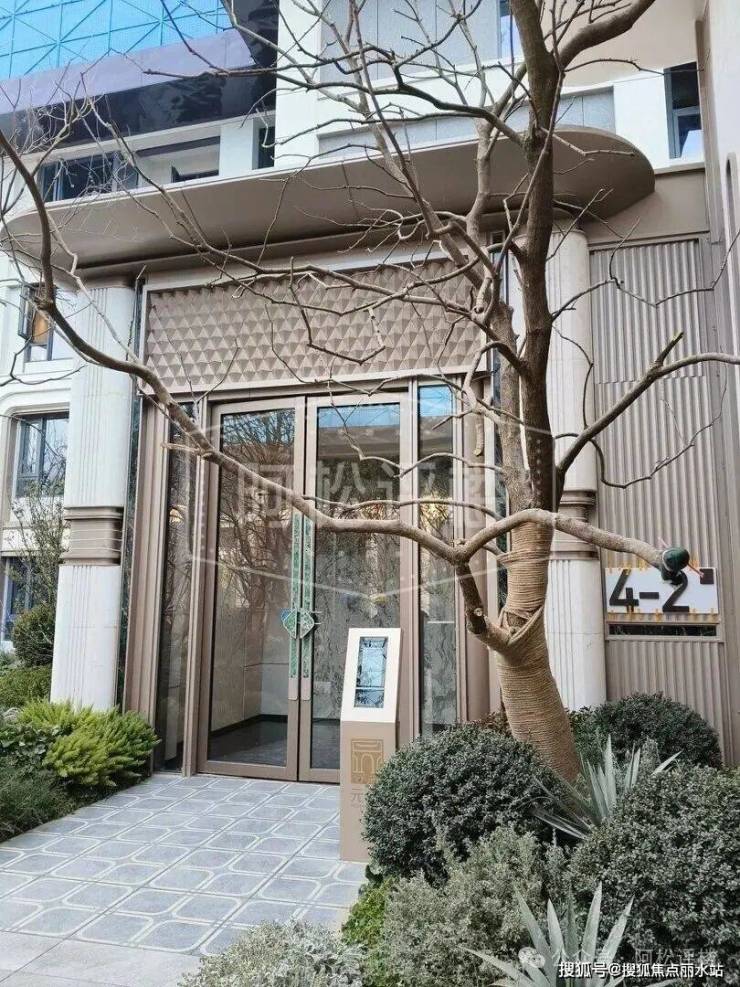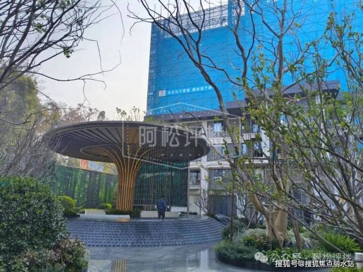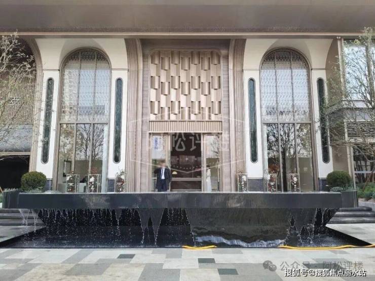 项目社区大门,前面有水景,有挑高,看着比较气派: