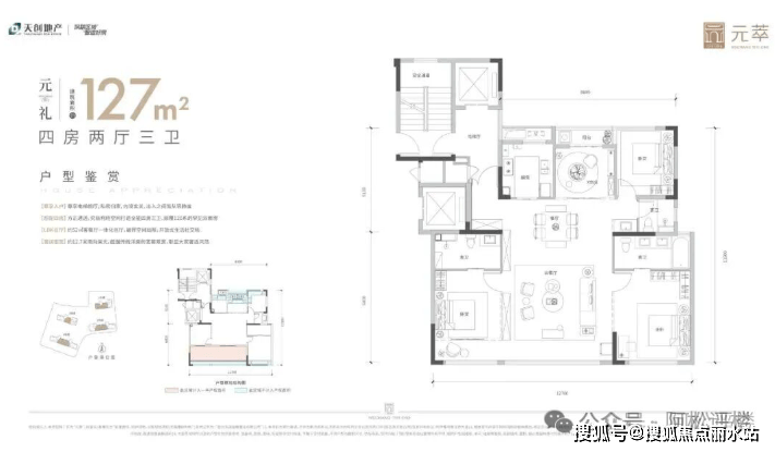 建面约127平,四房两厅三卫: