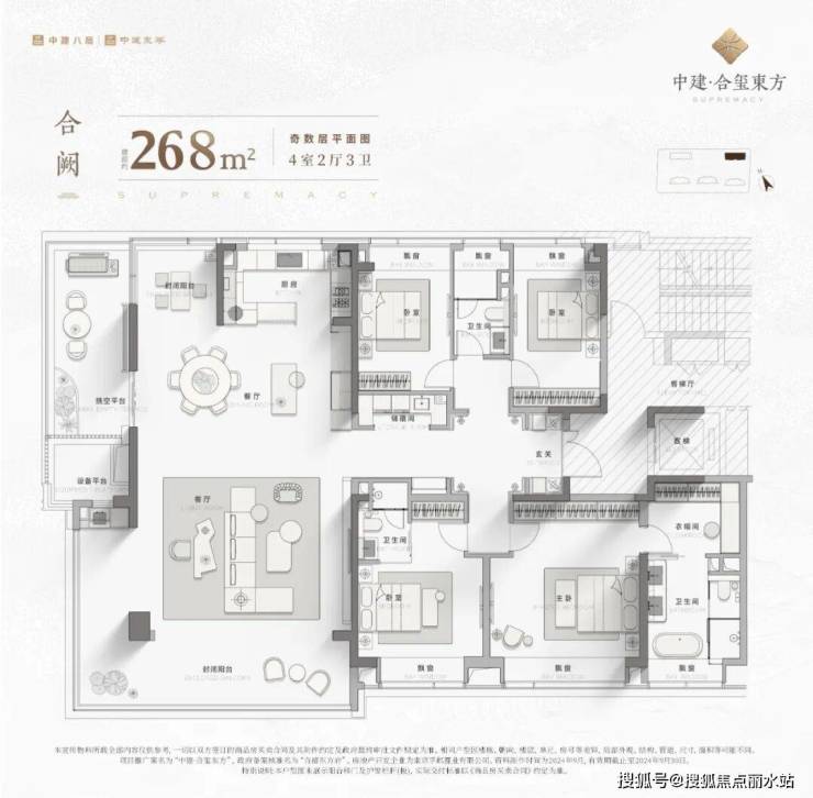268㎡户型独具超大客厅与双大套房,270度转角阳台带来开阔视野。项目更注重隐私保护,奇偶数层的露台错落有致,同层相连处特设高隐私挡板,有效隔绝视线干扰,营造极致私密空间。