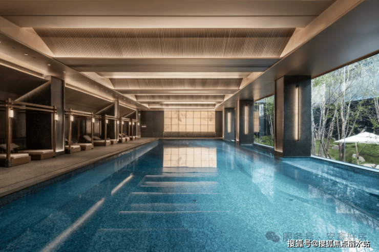 负一层会所以下沉式庭院为中心,设置有会客厅、恒温泳池、禅意茶室、健身房、瑜伽室和SPA房。