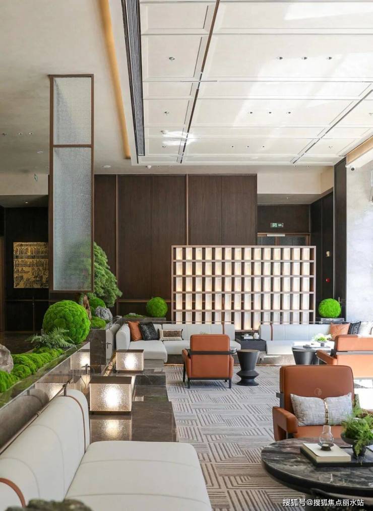 同时,项目入口公园,参考苏州留园的格局,在公园亭里有“月洞门”,运用“藻井”天花,在风雨连廊里有“挂落”,把苏州留园印象搬回家。