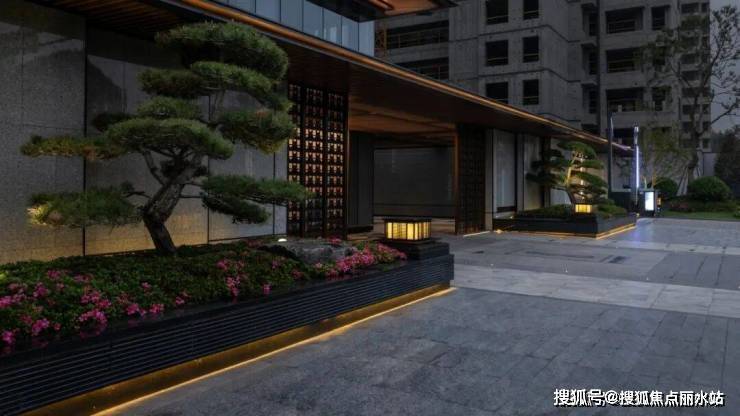 展示区西大门建设超36米宽的飞檐门庭、蟒水纹铝板、蓝眼睛花岗石自然面及仿石砖,入口精选近30万黑松,处处流露着雅致的东方人文气韵。