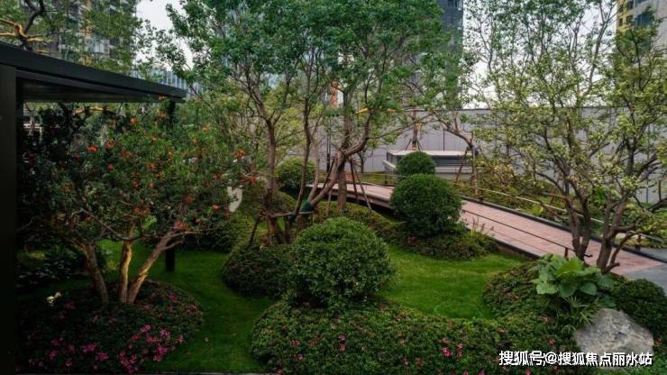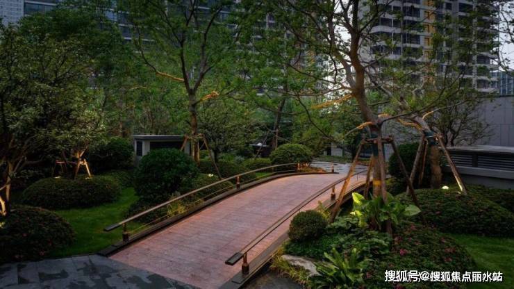 无桥不成园,有桥景更幽。通过造景、对景、框景等手法,在28米归家廊道间实现“步移景异”的沉浸体验。漫步虹桥,桥面起伏所带来的高度差能观赏到几乎所有的名贵树种;樱花、乌桕、海棠、紫薇、红枫等组成的“江南十二时节”植物画卷,尽享叠翠丰茂。